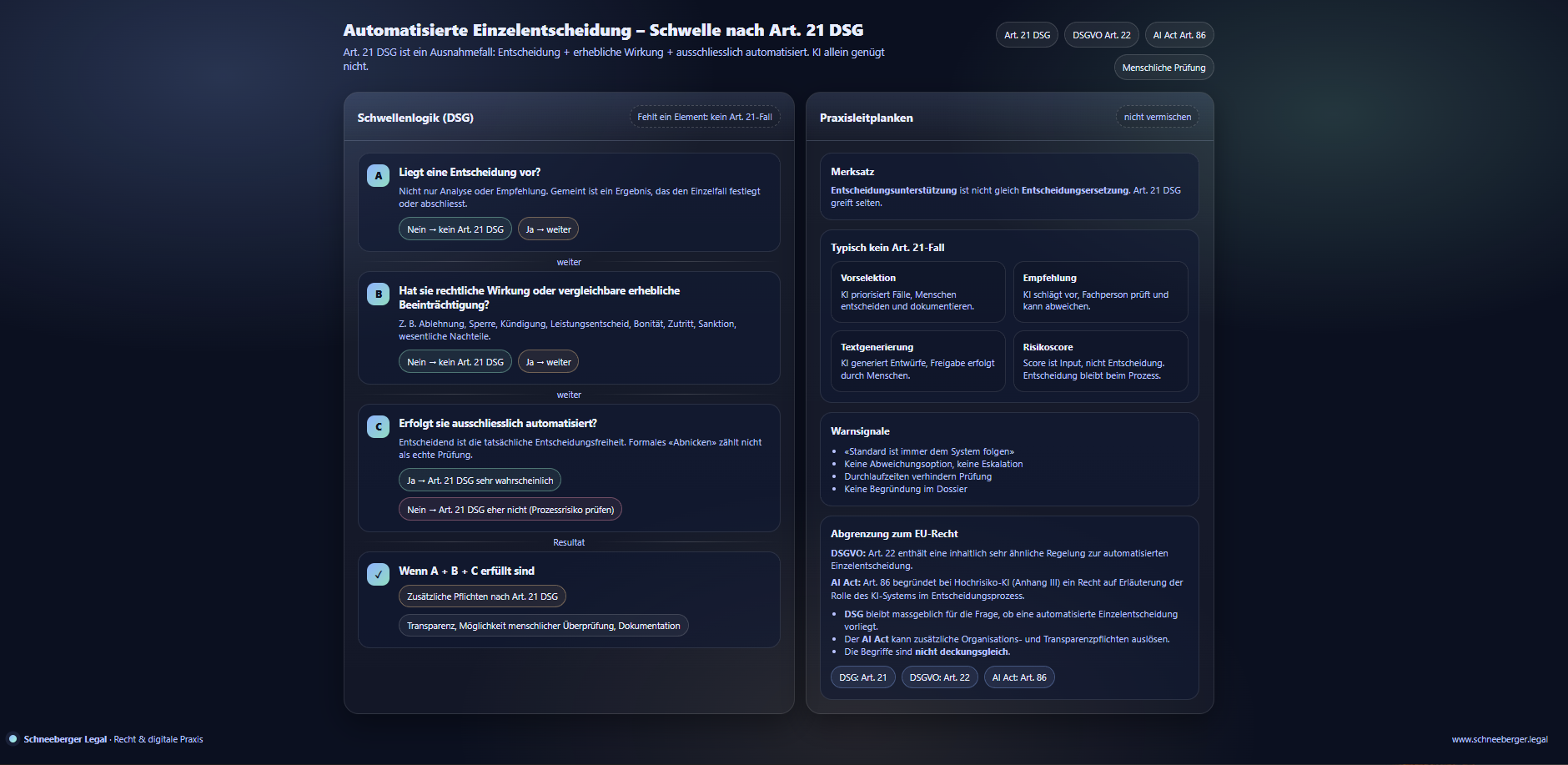 Das Datenschutzrecht knüpft die automatisierte Einzelentscheidung an klare Voraussetzungen (Art. 21 DSG):
