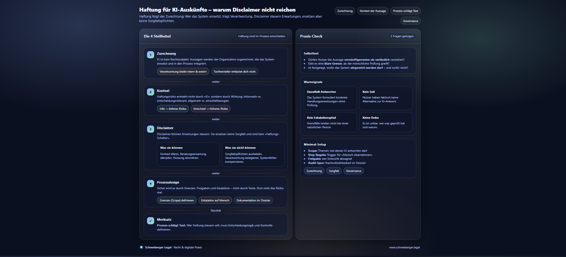 Haftung beim KI-Einsatz ist kein Tool-Problem, sondern ein Governance-Thema. Wer das versteht, braucht weniger Disclaimer – und trifft bessere Entscheidungen.